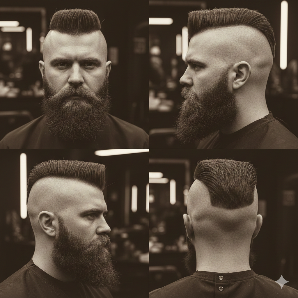 Van achter gezien is het veel langer naar achteren gekamd. Het kapsel stopt vrij hoog aan de achterzijde , dit zorgt ervoor dat het niet naar een "Mohawk stijl" gaat. Baard en Snor is niet vereist.. bij twijfel.. schrijf je gewoon in, vooraf over de chat kijken we samen even naar je haar. Als een iets andere variant jouw beter gaat staan, dan hoor je dat.